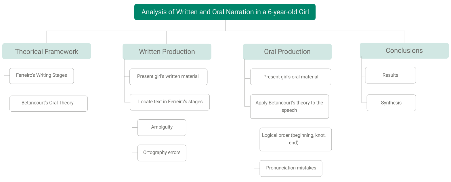 This first map preceded the writing of the final text. It allowed me to establish a logical order to organize the text sections and present the product to the reader in a way that was easy to understand. The text maintained a clear structure: we applied a specific theory to each production of the participant (oral and written) and we closed with the presentation of the results and a general synthesis.